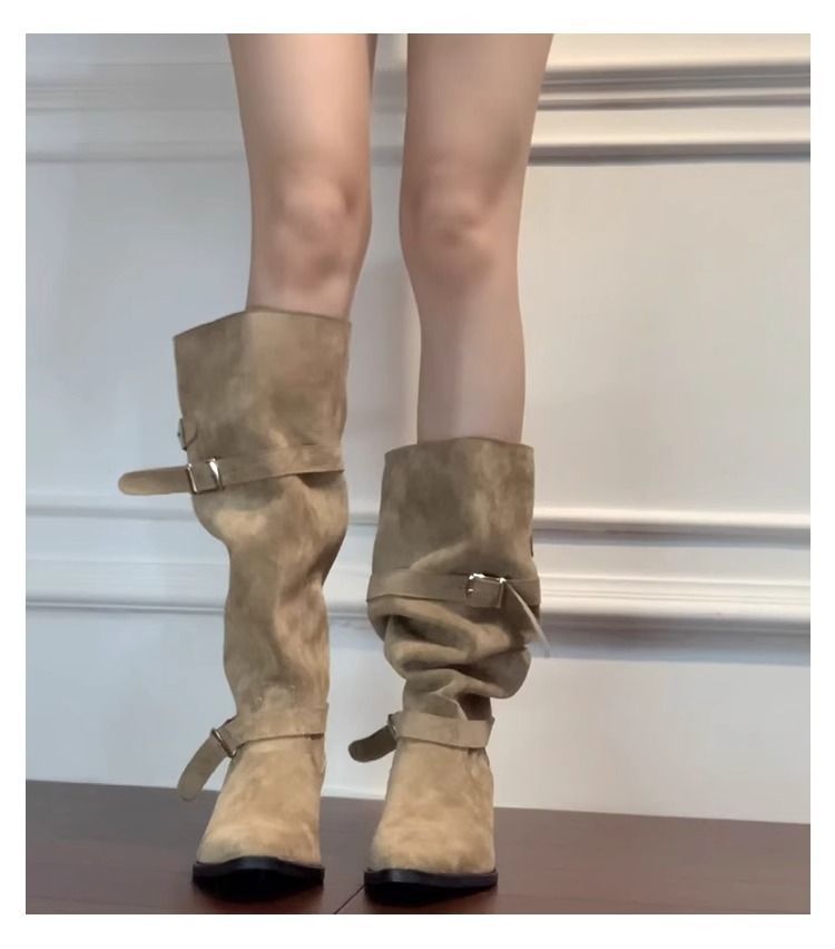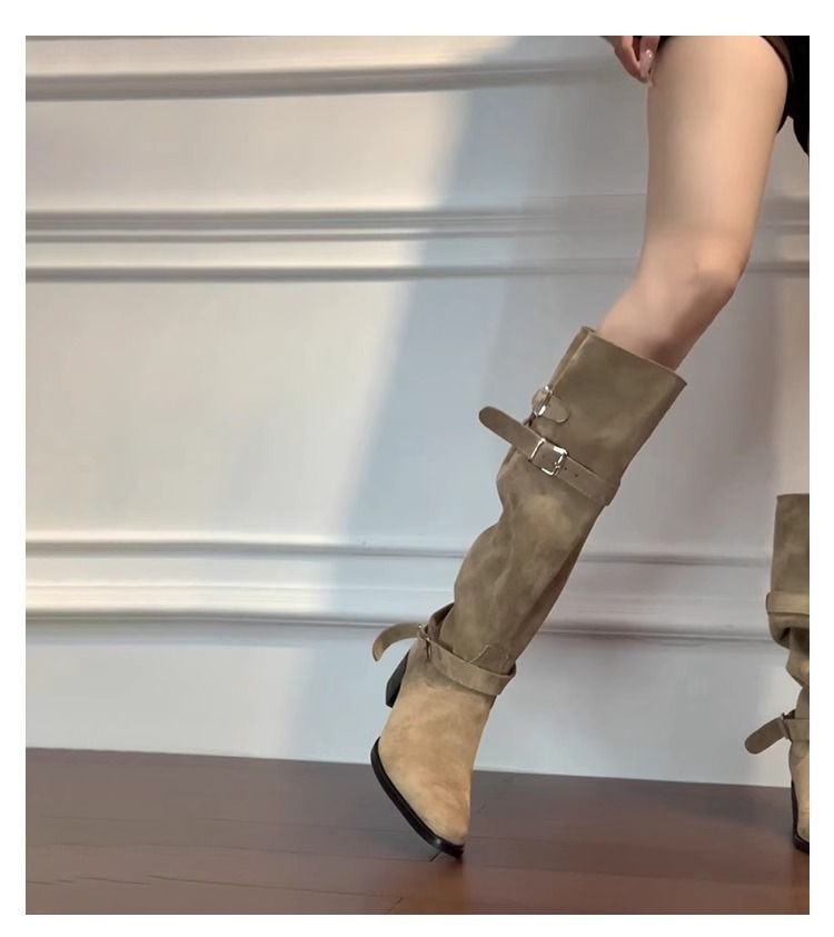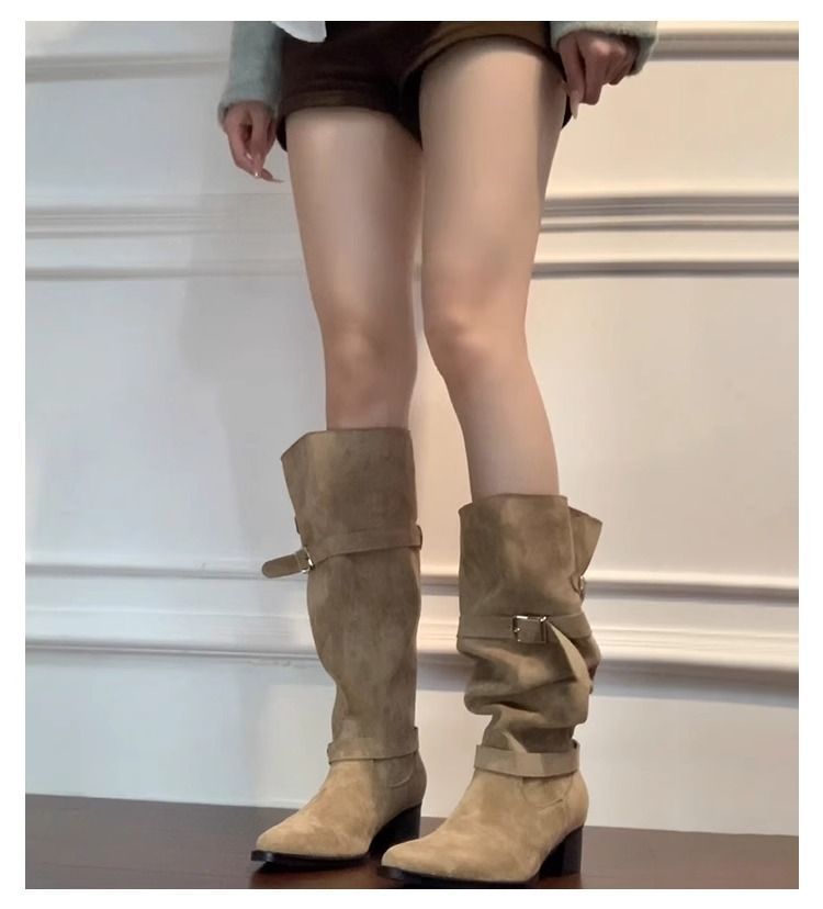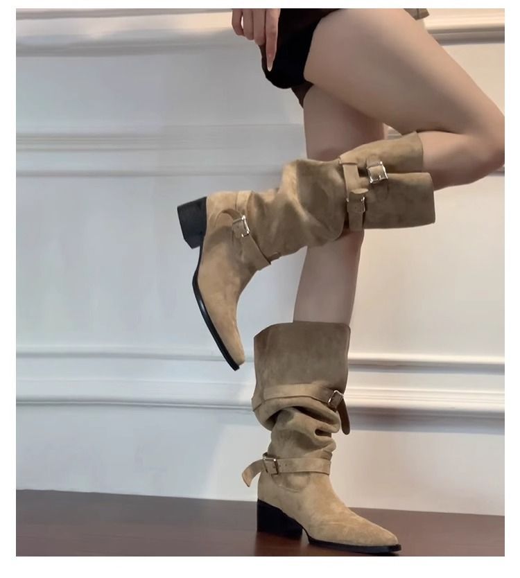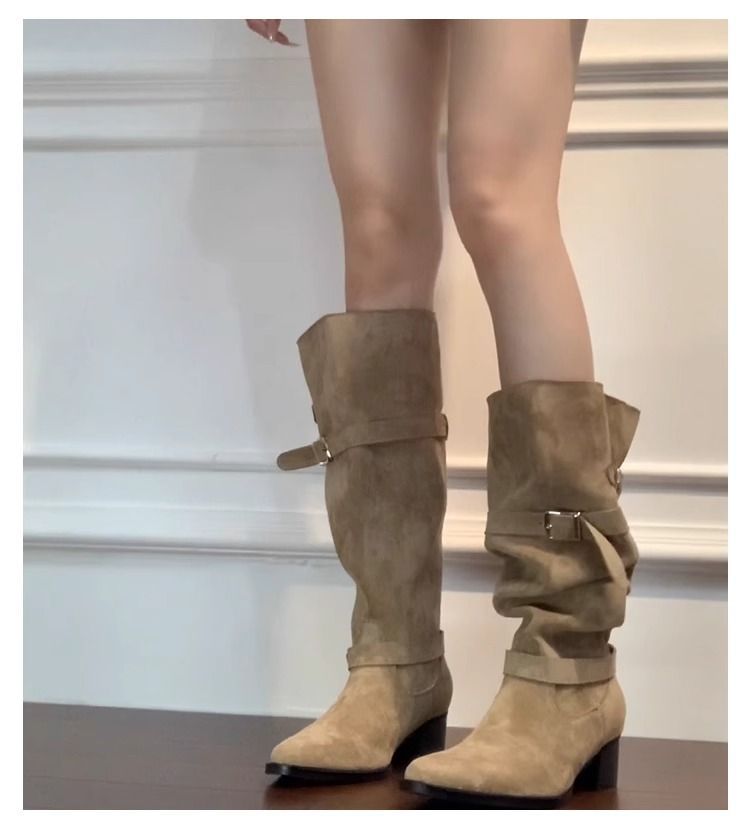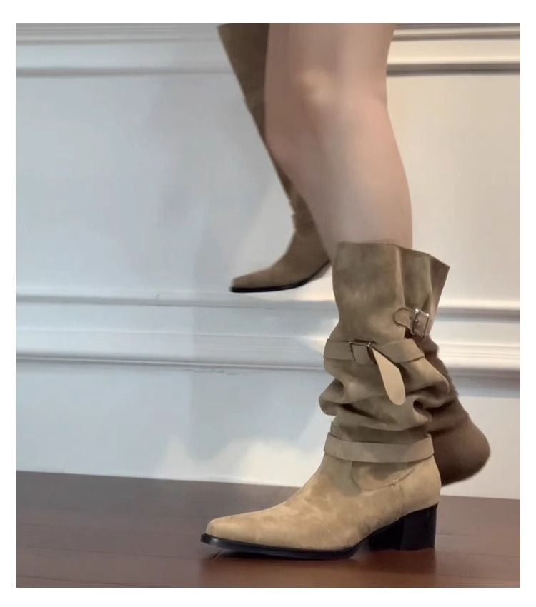 Autumn Khaki Suede Pointed-Toe Boots With Chunky Heels For Women