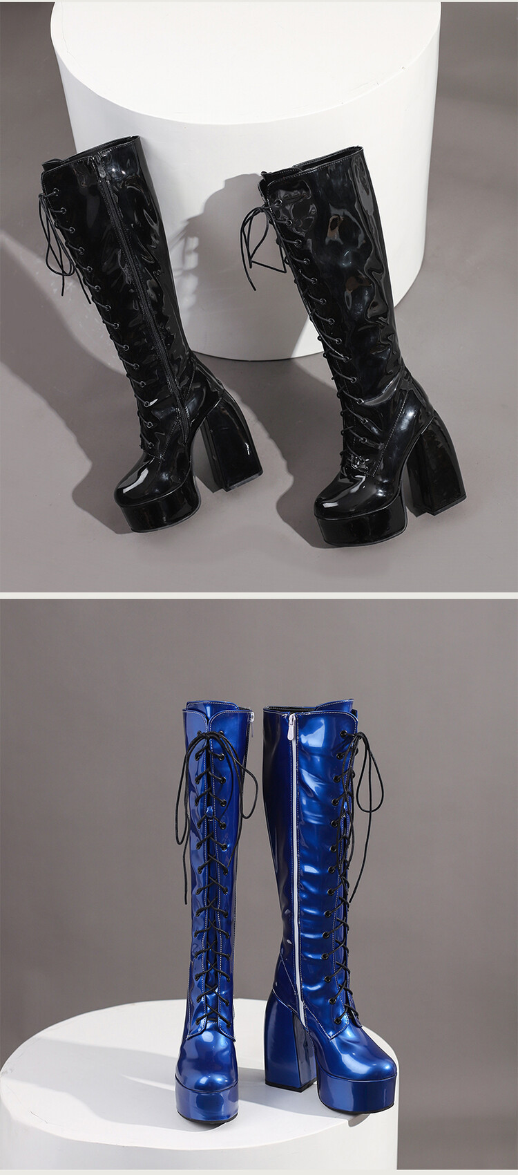 Womens Round-Toe Lace-Up Chunky-Heel Patent Leather Over-the-Knee Boots